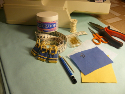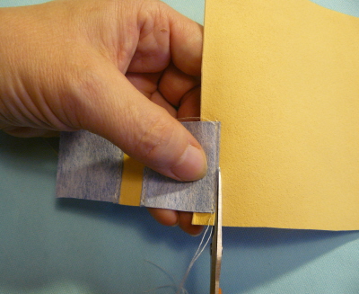 Säämiskän alle jäänyt osuus sinisestä kankaasta leikataan pois.
