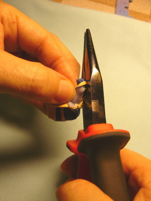 Kassin sisäpuolelta katkaistaan sivuleikkureilla neulojen päät lyhyiksi.