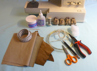 kangasta, ohutta ruskeaa nahkaa, metallilankaa, ompelulankaa, ohutta