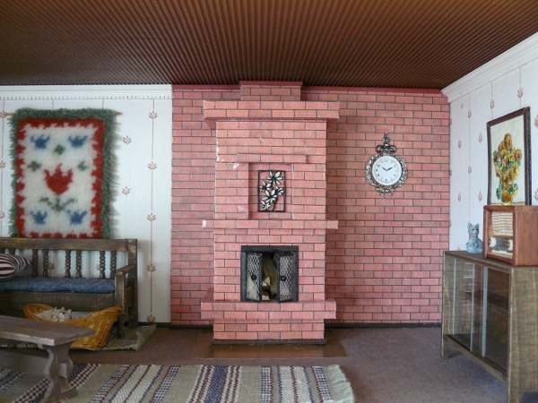 Takka on päällystetty tiilikuvioisella paperilla. Luukut on tehty metalliverkosta,