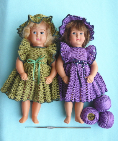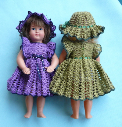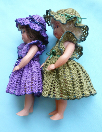 Nukkien mekot ja hatut on virkattu ohuesta helmilangasta koukulla numero 1.